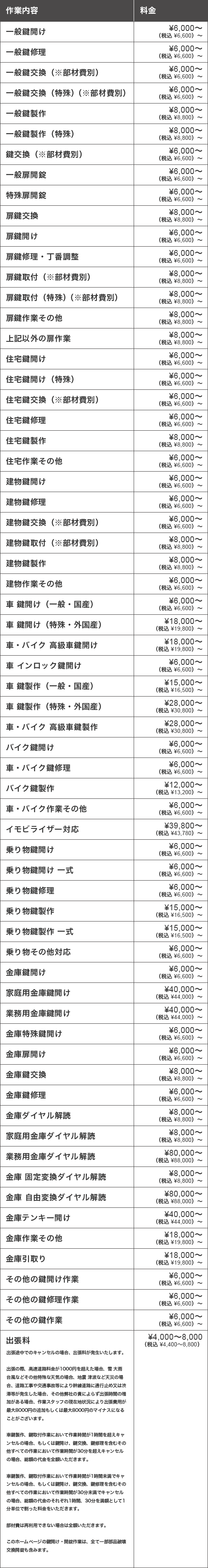 全国統一料金表がございますので認定錠前技師により料金が変わることがないよう取り組んでおります。全国統一料金表